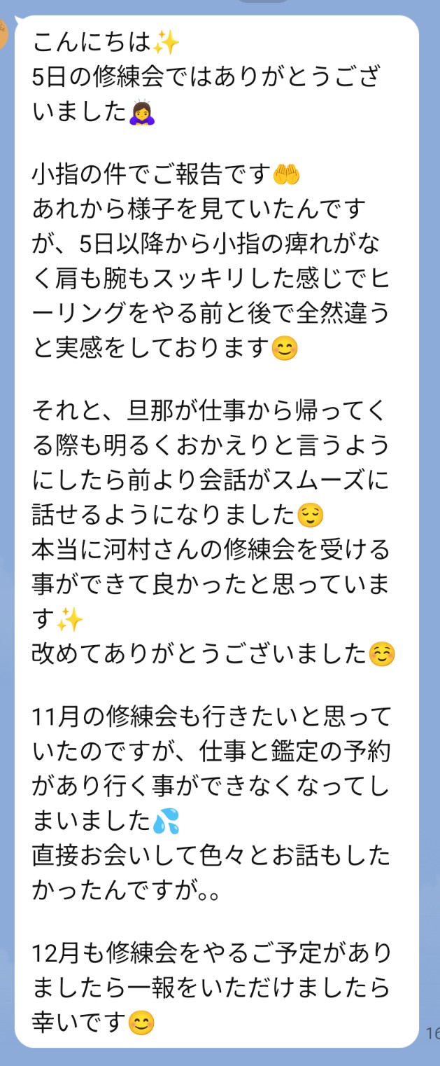 ヒーリングフォース修練会にご参加くださった方から、その後の嬉しいご報告を頂きました☺️